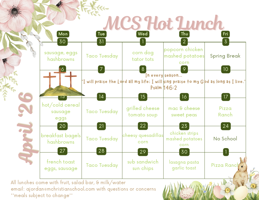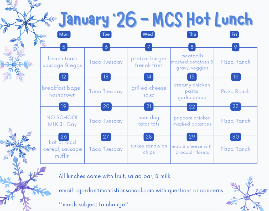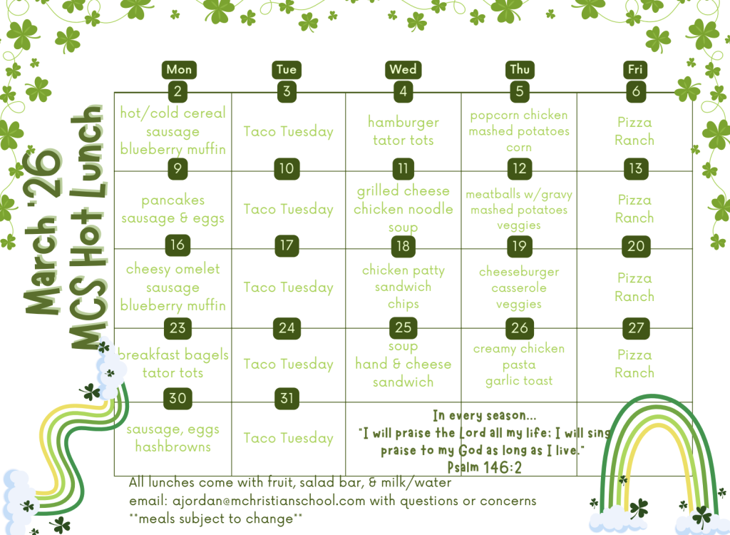 Hot Lunch is served each full school day. To view the monthly lunch menu, scroll to the bottom of this page.
